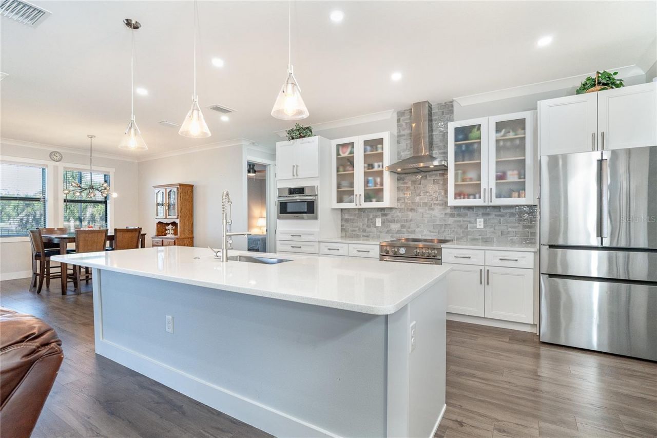 Prepare to be impressed when you step into your new home! Thoughtfully designed with soaring ceilings, 8-foot Doors, Coffered Ceilings, and Crown Molding throughout. This home offers a refined yet inviting atmosphere filled with natural light. The open-concept living area flows into a Chef's Kitchen featuring a Bertazzoni range and top-of-the-line Bosch appliances, including a Built-in wall oven that also functions as a microwave. The luxurious primary suite is a true retreat, showcasing a spa-inspired bathroom with a stunning walk-in shower and soaking tub. A versatile fourth bedroom with double doors can easily serve as a home office or den. A stylish guest bathroom featuring double sinks is conveniently located between two additional guest bedrooms. Outdoors, enjoy your own private oasis with a spectacular Lap Pool complete with Lighting, Sun Shelf, and pool heater. The oversized screened lanai is the perfect place to spend your evenings relaxing or entertaining. Seller is offering the home furnished with a few personal exclusions. This exceptional home is truly move-in ready. Schedule your private showing today.