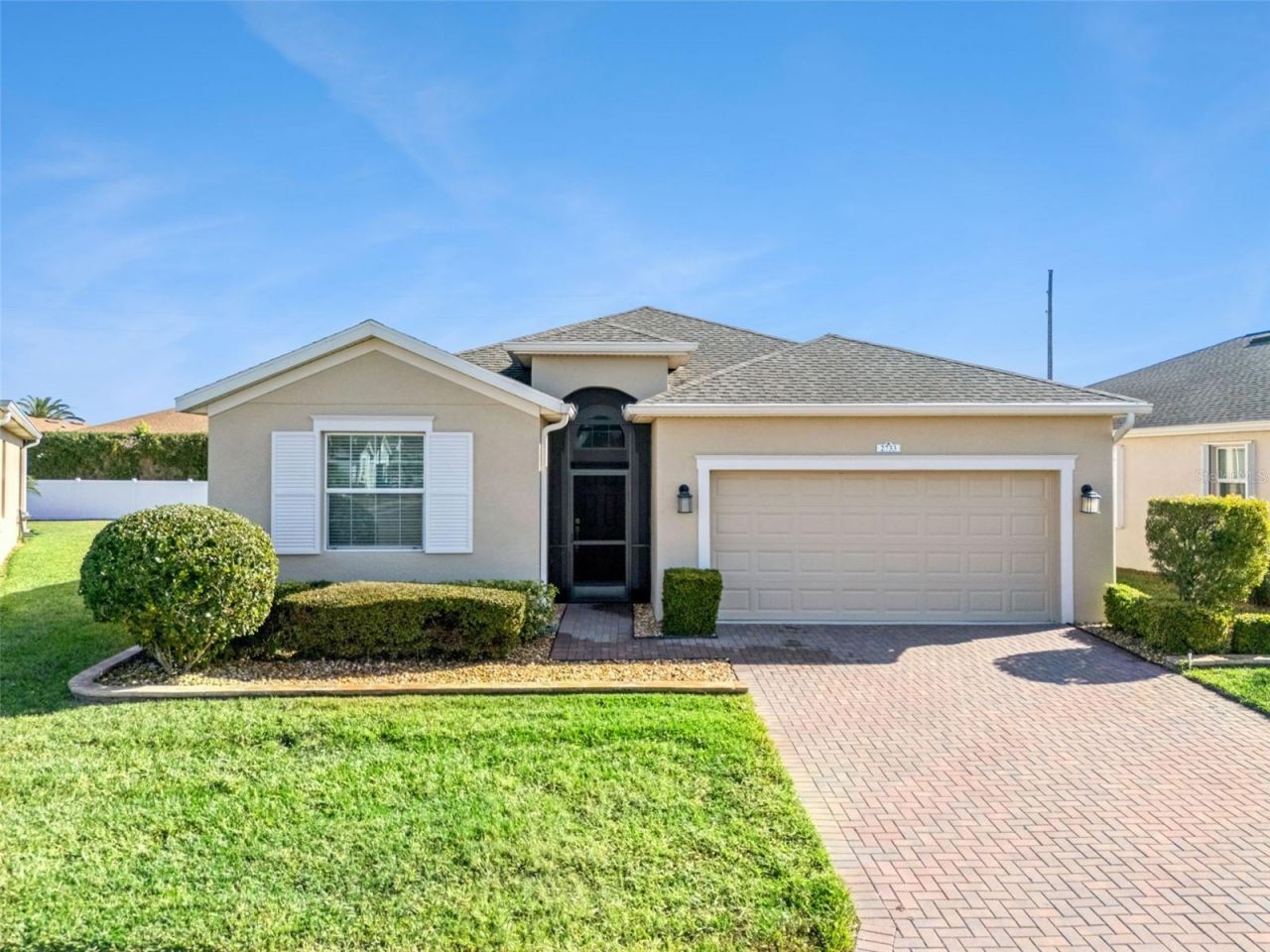This meticulously maintained 3-bedroom, 3-bath home showcases eco-smart features and true pride of ownership, all within the sought-after 55+ gated community of Traditions. Thoughtfully designed and beautifully upgraded, this residence offers comfort, efficiency, and a relaxed Florida lifestyle.Upon arrival, you're greeted by Florida-friendly landscaping accented with stone curb edging and a decorative paved walkway. The welcoming foyer features a transom window and a convenient coat closet. The spacious living and dining areas offer an open-concept layout enhanced with tile flooring-ideal for entertaining. Oversized sliding glass doors open to an extended screened-in lanai, seamlessly expanding the living space outdoors.The well-equipped kitchen features 42 upper cabinetry trimmed with crown molding, a stainless steel appliance package, and a walk-in pantry to meet all your culinary needs. A center island adorned with quartz countertops perfectly complements the glass tile backsplash, adding both function and style.The generously sized primary bedroom suite is a luxurious retreat, offering wall-to-wall carpeting and dual walk-in closets. The primary bath impresses with a handicap-accessible tiled shower featuring decorative listello tile, a comfort-height double-sink vanity, and a linen closet.A junior bedroom suite includes a private en-suite bath with a comfort-height vanity and quartz countertop-ideal for guests or extended stays. Step outside to your private oasis, where the paved screened lanai provides a peaceful setting for outdoor entertaining. This premium lot with no rear neighbors enhances privacy and tranquility. Additional Features & Upgrades Screened-in front entrance with paved walkway, Smart thermostat and smart home technology, Hybrid water heater, Low-E double-pane windows, Ring doorbell and MyQ garage door opener, Laundry room with washer and dryer, In-wall pest control system and termite bait traps, Exterior carriage lighting, Gutters, Two-car garage with epoxy finished floor.The picturesque Community of Traditions offers Planned Community Activities and an array of amenities such as a Lake Front Clubhouse, Dock & Boat Ramp, Heated Swimming Pool and Spa, Ballroom, Billiards, Meeting Room, Library, Computer Room, Craft Room, Dog Park, Tennis Courts, Basketball Court, Bocce, Shuffleboard, Fitness Center, and Aerobics Studio. Conveniently located near Shopping, Restaurants, Legoland and Major Routes, this home offers the perfect combination of luxury, comfort, and convenience.