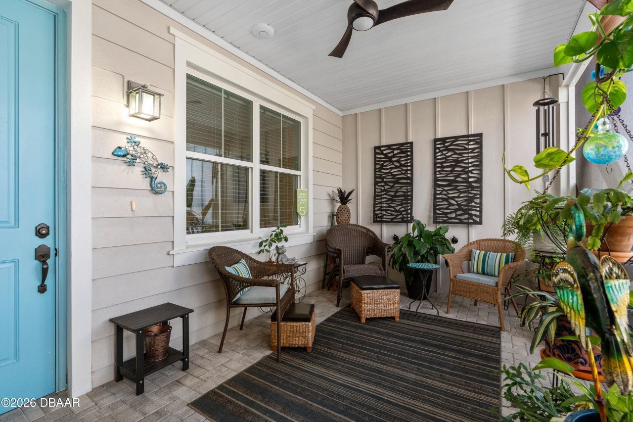 Warm and inviting Camellia Cottage with upgrades and lush landscaping in the highly sought-after Latitude Margaritaville Daytona Beach. Tucked away from road noise, this home offers a peaceful setting with relaxed coastal charm--ideal for full-time living or investment. Vaulted ceilings and tile flooring throughout create an open, airy great room. The light-filled interior features 8-foot doors and tasteful, high-end finishes. The open kitchen is designed for both everyday living and entertaining, showcasing designer-style cabinetry, quartz countertops, an extended island, custom backsplash, stainless steel appliances, gas range, pendant and under-cabinet lighting, soft-close doors, and double-stack pull-out drawers. A flexible dining room or den adds versatile living space. The primary suite offers a private retreat with a large walk-in closet, dual vanities, and a pebble-finished shower floor. Enjoy relaxing mornings and evenings on the front screened porch with micro-screening and a WiFi network extender. The laundry room includes upper cabinets for additional storage. Additional highlights include a 2-car garage (441 sq ft) with attic stairs, ceiling-mounted storage racks, and upgraded lighting fixtures throughout. Latitude Margaritaville is a premier 55+ private, gated community featuring three heated pools, a private beach club with oceanfront pool and coastal views, live music at the Bar & Chill Restaurant, poolside sandbar, Fins Up Fitness Center, Mango Theater, pickleball and tennis courts, dog park, and morewhere every day feels like a vacation.