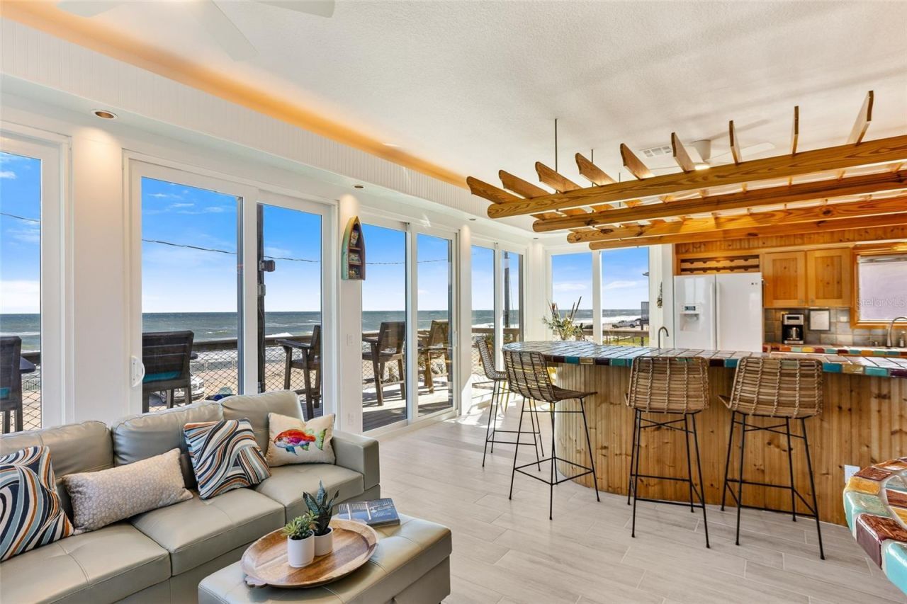 Welcome to 'Little Latitude, a one-of-a-kind oceanfront retreat set along the picturesque Bethune Beach Promenade. This vibrant beach house captures the carefree Margaritaville spirit with a perfect blend of coastal charm and relaxed elegance. Step into a world where every detail invites tranquility - where dual panoramic views of the Atlantic Ocean and Intracoastal Waterway frame your days. This custom home features over 1,100 SF of elevated outdoor living space, including multiple oceanside decks and a sheltered rooftop crow's nest offering breathtaking views of rocket launches from the Kennedy Space Center. Designed for versatility, this property offers two separate living spaces with private entrances-ideal for multi-generational living, guest privacy, or rental income potential. The main level offers 2 bedrooms and 2 full baths with an open-concept living area, floor-to-ceiling oceanfront sliders, a spacious kitchen with breakfast bar, and a dining area showcasing panoramic views. The lower level features 2 bedrooms and 1 bath, a cozy living area, and a kitchenette with full-size appliances. Enjoy seamless indoor-outdoor living with wrap-around decks, tropical landscaping, and beach access just steps away. Whether watching dolphins at sunrise, rockets launching at sunset, or relaxing under the stars, 'Little Latitude is a coastal haven where every day feels like a vacation. Additional features include: laundry rooms on both levels, multiple smart TVs, separate entrances for privacy and flexibility, and completely furnished. The county-maintained concrete seawall and staffed lifeguard station provide peace of mind. Meticulously maintained and updated with new windows, sliders and exterior doors, tile flooring throughout, two HVAC systems, and a new metal roof (2023). The property also offers an outdoor shower, firepit, BBQ area, and enclosed garage. Manatee Park, located nearby, features a volleyball court, fishing pier, and kayak launch where dolphins and manatees are frequently seen. Within minutes of upscale dining, boutique shopping, private marinas, and the charm of historic Flagler Avenue, this beachfront home offers the perfect balance of exclusivity and accessibility. This is your ultimate entertaining beach home - offered fully furnished, where all you need to bring is your toothbrush --and maybe your flip flops. Come see this unique property for yourself and make it yours today!