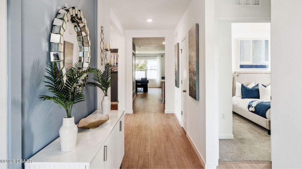 The popular one-story Cali floorplan offers 4-bedrooms, 2-bathrooms, a 2-car garage with 1,882 sq ft of living space. The open layout connects the living room, dining area, and kitchen, ideal for entertaining. The kitchen boasts quartz countertops, stainless-steel appliances, a walk in pantry and a spacious island. The four spacious bedrooms gives flexibility for various lifestyles. The primary suite located in the rear of the home features a private ensuite bathroom with dual sinks, a separate shower, and a walk-in closet. The remaining three bedrooms share one well-appointed bathroom, making morning routines a breeze. Laundry room is convenient to all bedrooms. This all concrete block construction home also includes smart home technology for control via smart devices. *Photos are of similar model but not that of exact house. Pictures, photographs, colors, features, and sizes are for illustration purposes only and will vary from the homes as built. Home and community information including pricing, included features, terms, availability and amenities are subject to change and prior sale at any time without notice or obligation. Please note that no representations or warranties are made regarding school districts or school assignments; you should conduct your own investigation regarding current and future schools and school boundaries.*